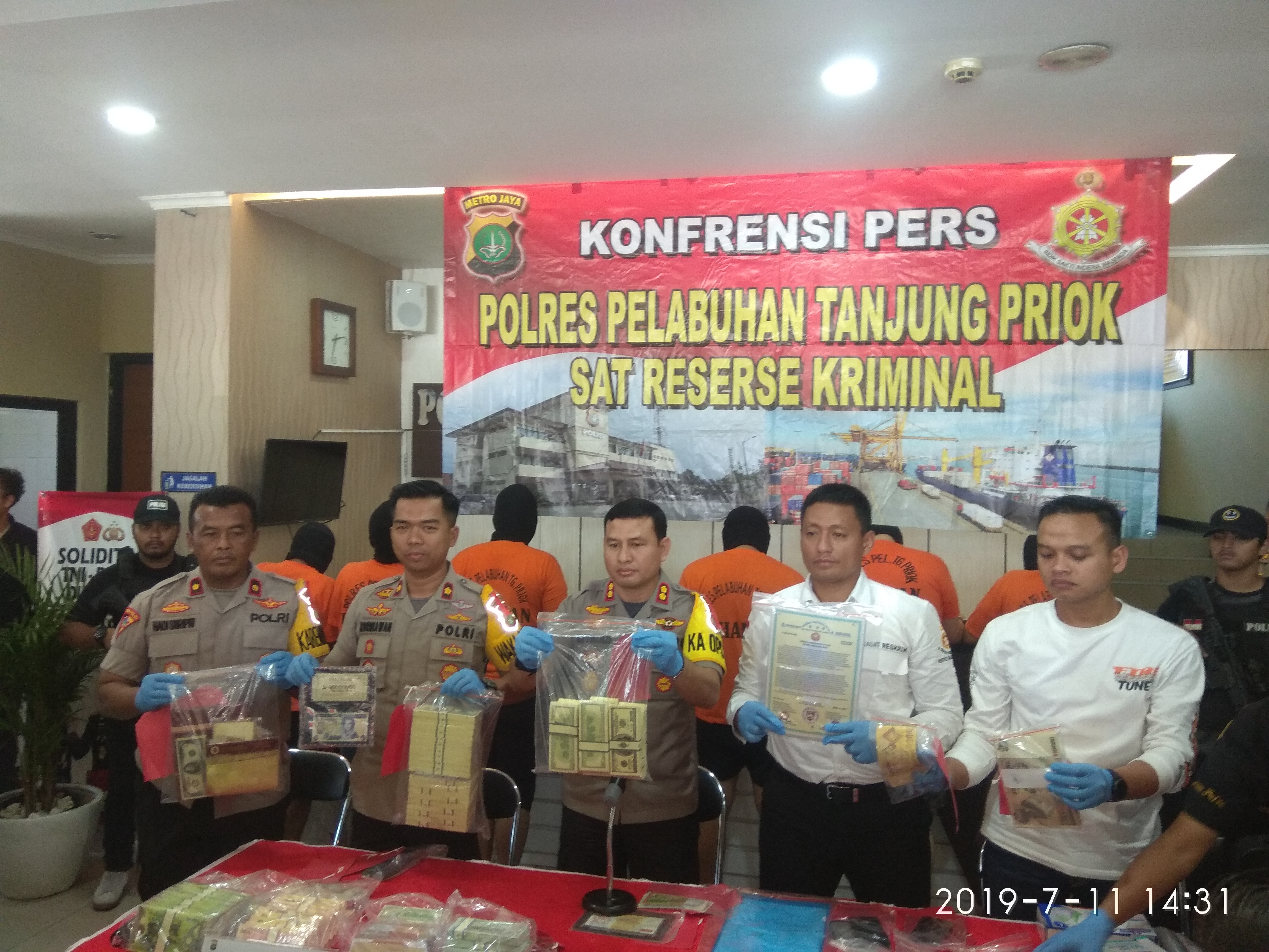 Dalam keterangannya, Kapolres Pelabuhan Tanjung Priok, Reynold Hutagalung menyampaikan kronologis penangkapan terhadap 7 orang pelaku pengedar uang palsu. Awal nya pada hari kamis tanggal 4 Juli 2019 sekira jam 14.10 Wib di Jl. Raya Kelapa Nias Kelapa Gading, Jakarta Utara, tersangka dengan mengedarkan mata uang asing dengan cara diperjual belikan kepada Masyarakat Umum untuk mendapatkan keuntungan.