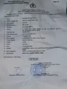 “Atas peristiwa ini, kami telah melaporkannya ke Polda Metro Jaya, berdasarkan LP Nomor STTLP/B/5537/XI/2021/SPKT/Polda Metro Jaya tanggal, 04 November 2021. Kami melaporkan karena saya mengalami luka memar di bagian wajah, rasa sakit pada leher dan tulang rusuk sebelah kanan.” beber (D).